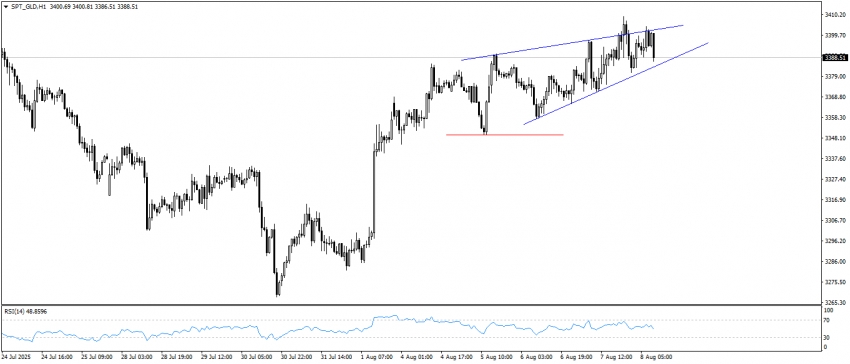 يتحرك الذهب على المدى اللحظى الى القصير فى اطار نموذج الوتد الصاعد وهو نموذج سلبى ظهر على فريم الساعة، يكتمل هذا النموذج ويعطى اشارة بيع بكسر الحد السفلى عند مستوى 3380 ليعطى مستهدف هبوطى اولى عند 3365 والهدف الثانى عند 3350